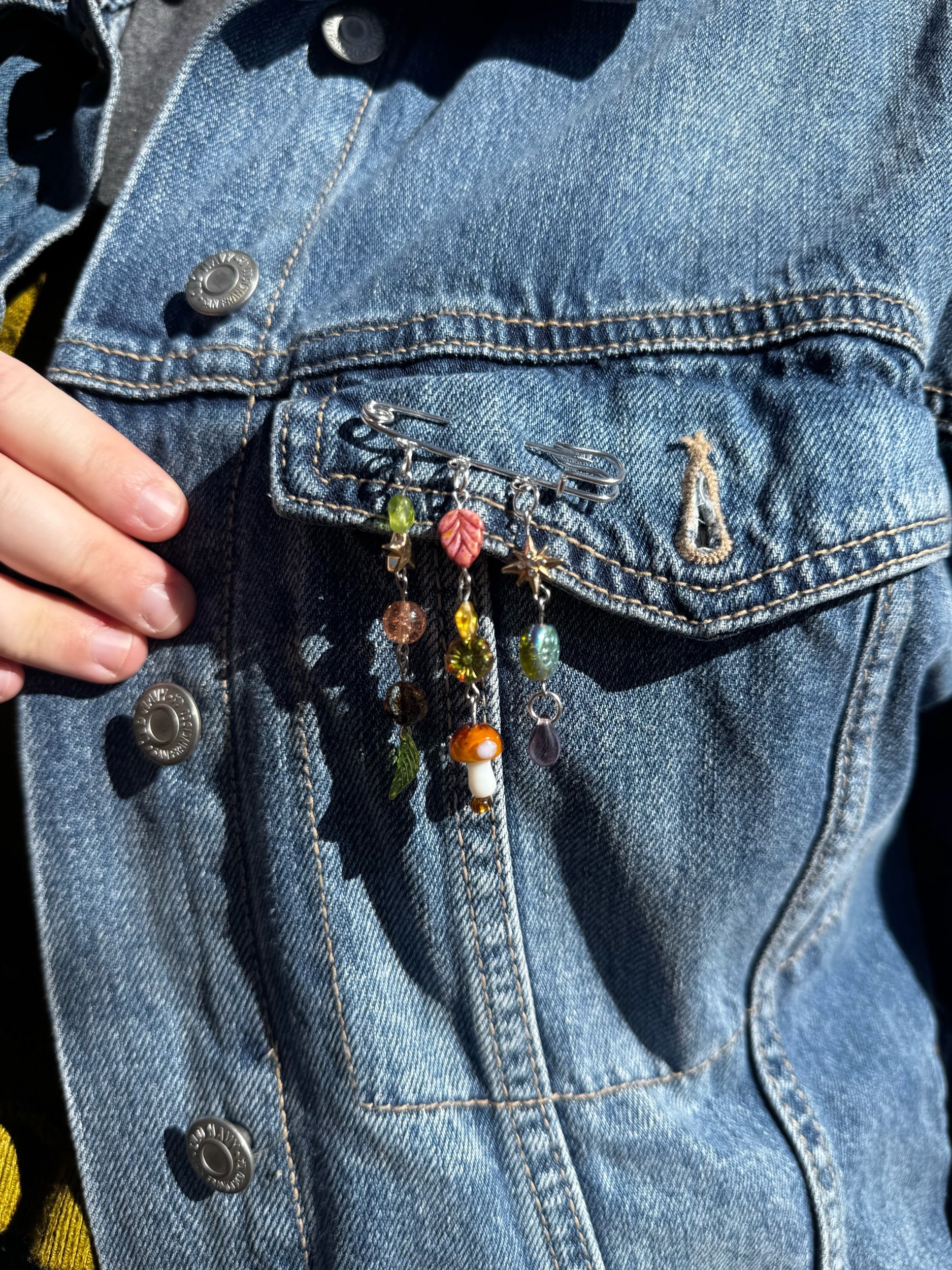 made with real gemstones, czech glass, and metal beads. pin is lead and nickel free.