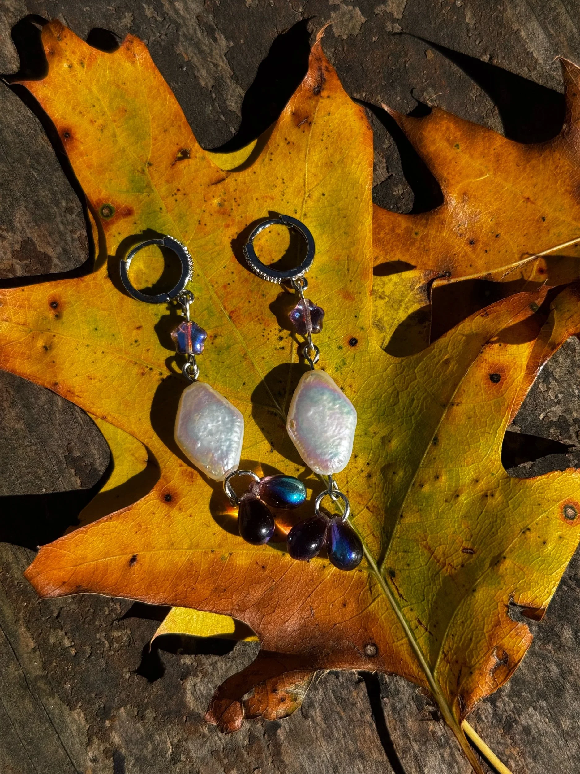 silver only. made with purple/pink color shifting czech glass stars and teardrops, and a diamond shaped pearl. choose between a ‘diamond’ hoop (pictured) or a regular silver hoop. both are lead and nickel free.